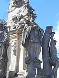 Die Dreifaltigkeitssäule auf dem Kirchenplatz von Wolkersdorf im Weinviertel trägt unter anderem als Sockelfigur eine Statue Johannes Nepomuks. | ||