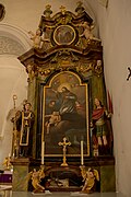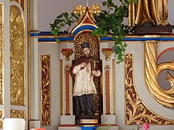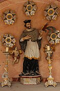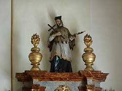 Auf dem Seitenaltar der Marienkapelle der Pfarrkirche von Kirchbach befindet sich eine Darstellung Johannes Nepomuks als rechte Seitenfigur. | ||