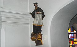 An der linken Langhauswand der Pfarrkirche von Brand steht eine polychromierte Statue Johannes Nepomuks aus der Mitte des 18. Jahrhunderts. | |||