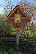 In Heitzles steht ein überdachtes Wegkreuz mit einem Bild des hl. Johannes Nepomuk. | ||