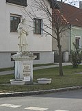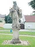 Die Statue des Heiligen steht vor der Pfarrkirche von Illmitz in der Unteren Hauptstraße | ||