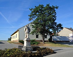 Beim Schloss von Potzneusiedl steht eine Nepomukfigur auf einem Sockel. | ||