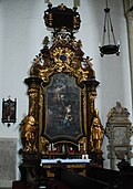 | Johannes-Nepomuk-Altar im Chor des rechten Seitenschiffes des Domes Mariä Himmelfahrt in der niederösterreichischen Bezirkshauptstadt Wiener Neustadt . Ein spätbarocker Altarretabel mit Volutenpfeilern und einem geschwungenen Giebel, der von einer Gloriole bekrönt wird. In der Baldachin-Nische die Figur des hl. Johannes Nepomuk . | Eigenes Werk | C.Stadler/Bwag | Datei:Neustadt - Dom, Nepomuk-Altar.JPG | |