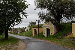 Die einseitige Kellergruppe aus neun Kellern in Schildmauerform liegt in der Ebene südöstlich außerhalb der Ortschaft. Sie besteht aus einer 100 Meter langen Reihe von sechs Kellern, zwei Kellern etwa 100 Meter nördlich, und einem Keller etwa 50 Meter östlich. | |