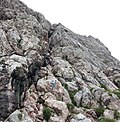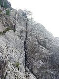 Der nicht durchgehend mit Seilen gesicherte Steig war der erste versicherte Anstieg über die Nordseite der Hohen Warte. Er führt vom Wandfuß bis zum Gipfel und nimmt den Weg der 26er auf, welcher als alternativer Steig weiter östlich durch den Wandsockel führt. |