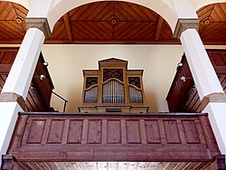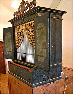 | Orgel der röm.-kath. Pfarrkirche hl. Johannes der Täufer in der oberösterreichischen Gemeinde Arbing . Die Orgel wurde ab 1858, nach heutigem Wert um umgerechnet 82.738 Euro, von Josef Breinbauer errichtet und 1861 in Betrieb genommen. Am 8. Februar 1918 mussten die originalen Prospektpfeifen ans Kriegsministerium abgegeben werden und im Jahr 1927 ergänzte der Orgelbauer Josef Panhuber die Orgel mit 39 neuen Zinkpfeifen. Nach rund 30 Jahre Spielpause wurde die siebenregistrige Orgel Anfang der 2000er Jahre renoviert und am 4. Juni 2004 durch Diözesanbischof Maximilian Aichern wieder geweiht. | Eigenes Werk | C.Stadler/Bwag | Datei:Arbing - Kirche, Orgel.JPG | |