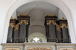1847[15] | II/P | 31 | 1739 von Gottfried Sonnholz ursprünglich gefertigt.[16] 1847 wurde die Orgel von Joseph Seyberth (Josef Seibert) umgebaut und durch den Anbau seitlicher Flügel vergrößert.[17] | ||
