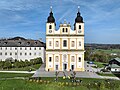 | Südansicht der Wallfahrtkirche Maria Plain in der Salzburger Gemeinde Bergheim und links das Superioratsgebäude (um 1675 errichtet). Die Wallfahrtskirche wurde ab 1671 von dem Salzburger Hofbaumeister Giovanni Antonio Dario erbaut und am 12. August 1674 vom Bauherrn Erzbischof Max Gandolf geweiht. Die Doppelturmfassade mit drei Eingängen besitzt im Erdgeschoß und im ersten Obergeschoß je zwei halbrunde Nischen. Darin befinden sich die übergroßen Darstellungen der vier heiligen Evangelisten Matthäus (mit Engel, oben links), Markus (mit Löwen, oben rechts), Lukas (mit Stier, unten links) und Johannes (mit Adler, unten rechts). Im Giebel des Mittelportals befindet sich das Wappen des Erbauers und über diesem ein Relief mit Maria und dem Kinde: 1 . | Eigenes Werk | C.Stadler/Bwag | Datei:Bergheim - Wallfahrtskirche Maria Plain (b).JPG | |