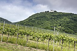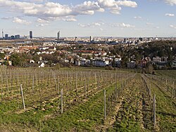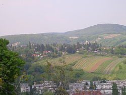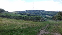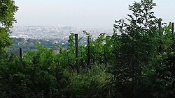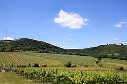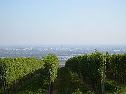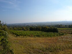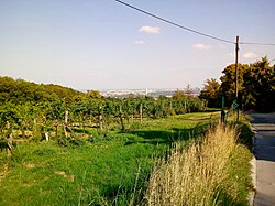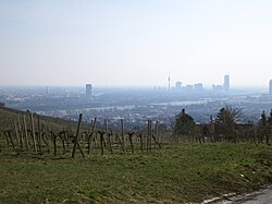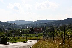 | Blick von der Agnesgasse in Wien auf Neustift am Walde und dessen Weingärten. Auf den Hügeln in der Bildmitte liegt Salmannsdorf. Der Berg links hinten ist der Dahaberg, der Turm daneben die Richtfunkstation Exelberg. | Eigenes Werk | Funke | Datei:Agnesgasse Neustift am Walde.jpg |