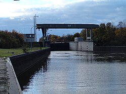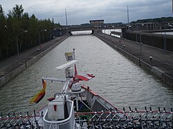 | Fotografie | Name der Schleuse | Land | Ort oder Objekt | bei km | Fallhöhe in m | Länge und Breite in m |