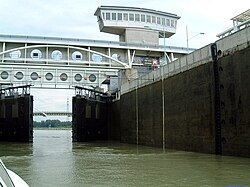 Das zugehörige Wasserkraftwerk liefert maximal 280 MW. Mehr als 10.000 Schiffe passieren jährlich die Schleuse. | Lage |