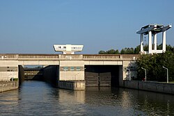 Die Schleuse für die Großschifffahrt ist verbunden mit dem Kraftwerk Regensburg. Sie liegt im sogenannten Europakanal und arbeitet funkferngesteuert.[2] Das Bild zeigt die Sportbootschleuse. |