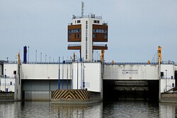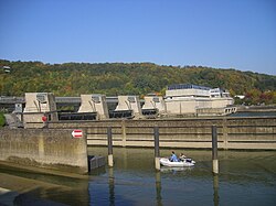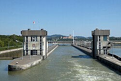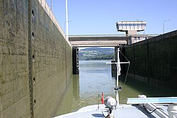 | Einfahrt zu den beiden Schleusenkammern der Donauschleuse Altenwörth von der Talseite aus gesehen | Eigenes Werk | Rennboot | Datei:210905 Schleuse Altenwörth.jpg | |