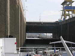 | Einfahrt zu der südlichen Schleusenkammer der Donauschleuse Melk von der Bergseite aus gesehen mit dem Kloster Melk im Hintergrund | Eigenes Werk | Rennboot | Datei:210907 Schleuse Gabcikovo.jpg | |