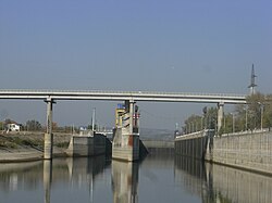 Diese Schleuse ist in einem weiter nördlich liegenden Arm der Donau eingebaut. Hier ist kein weiteres Kraftwerk integriert. | Lage |