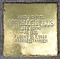 Ernestine Grünberg (geboren am 8. März 1897 in Sereth in der Südbukowina). Sie war die Mutter von Elfriede Grünberg und wurde am 9. Juni 1942 gemeinsam mit ihrer Tochter von ihrem letzten Wiener Wohnort, dem Haus Blumauergasse 22 in der Leopoldstadt, in das Vernichtungslager Maly Trostinez deportiert. Dort ist sie laut Opferdatenbank des DÖW am 15. Juni 1942 ermordet worden. |