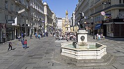 - Graben, 1294 erstmals als Verkehrsfläche und um 1300 als Marktplatz erwähnt. Der Graben geht schon auf das alte Römerlager Vindobona zurück, wo eine Mauer entlang des heutigen Straßenzugs und der heutigen Naglergasse die südwestliche Umwallung des Kastells bildete, vor der sich ein Graben befand. Auch vor der mittelalterlichen Burgmauer war dieser Graben noch vorhanden. Am Ende des 12. Jahrhunderts wurde der Graben im Zuge der babenbergischen Stadterweiterung zugeschüttet und planiert. Heute ist der Graben eine der bekanntesten Straßen Wiens. 1971 bzw. 1974 wurde hier die erste Fußgängerzone Wiens eingerichtet. Teile des Grabens trugen zeitweise verschiedene Bezeichnungen: Unter den Melbern, Mehlzeile, Milchgraben, Kaltenmarkt, Fleischgraben, Grüner Markt und Kräutermarkt. Der Graben war einst an beiden Enden kürzer als heute; dem Verkehr im Weg stehende Häuserblöcke wurden 1840 bis nach 1866 demoliert.