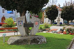 Gedenkstätte der Heimatvertriebenen aus der ehemaligen Pfarre Deutsch Reichenau. 14 Granitsteine tragen die Ortsnamen der Pfarrgemeinde |