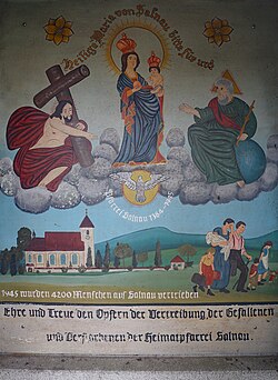„In dieser Kirche feierte Generalvikar Prälat DDr. Josef Kadras am 21. November 1965 den ersten Gedenk- und Dankgottesdienst der Volksdeutschen Heimatvertriebenen; Donauschwaben, Sudetendeutsche, Gottscher, Untersteirer und Mißtaler, Siebenbürger Sachsen.“ |