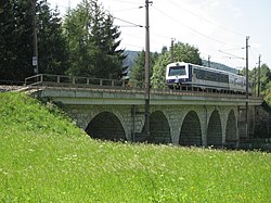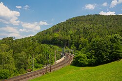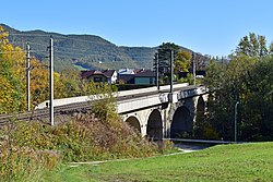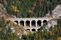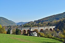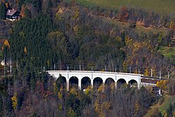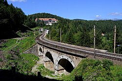 | Das Viadukt Kalte Rinne der Semmeringbahn in der niederösterreichischen Gemeinde Breitenstein, das gerade von einem Railjet (Siemens ES64U4) im Design der České dráhy befahren wird und ganz links das ehemalige Wächterhaus WH 167, das aktuell (2021) als Gheha-Museum genutzt wird. Das Viadukt im Adlitzgraben bei Bahnkilometer 98,79 hat eine Länge von rd. 185 Metern und eine Höhe von 46 Metern. Es ist ein Bauwerk der ersten normalspurigen Gebirgsbahn Europas, der Semmeringbahn, die von Carl von Ghega geplant und 1854 eröffnet wurde. | Eigenes Werk | C.Stadler/Bwag | Datei:Breitenstein - Semmeringbahn, Viadukt Kalte Rinne.JPG | |