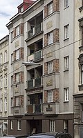 | Wohnhausanlage Brüßlgasse 34 in Wien-Ottakring. Außenfassade. Dieses Bild zeigt das in Österreich unter der Nummer 52216 denkmalgeschützte Objekt. ( Commons , de , Wikidata ) | Eigenes Werk | Michael Kranewitter | Datei:Brüßlgasse 34 - Außenfassade I.jpg |