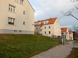 | Der stark zurückversetzte Mitteltrakt mit seinen sechs monumentalen Türmen der denkmalgeschützten Wohnhausanlage Karl-Marx-Hof der Gemeinde Wien im 19. Wiener Gemeindebezirk Döbling . Der Bau mit 1382 (aktuell rd. 1270) Wohneinheiten wurde von 1927 bis 1933 nach Plänen des Architekten Karl Ehn errichtet (die offizielle Eröffnung der Anlage fand am 12. Oktober 1930 statt). Er ist wohl der repräsentativste, sicherlich aber der bekannteste kommunale Wohnbau der Stadt Wien als Musterbeispiel eines monumentalen Superblocks . Er erstreckt sich über 1.100 Meter entlang der Heiligenstädter Straße und ist damit der längste zusammenhängende Wohnbau der Welt. Die vier Figuren über den Rundbögen sind Werke des Bildhauers Josef Franz Riedl (1884–1965) und symbolisieren die „Freiheit“, die „Fürsorge“, die „Aufklärung“ und die „Körperkultur“. | Eigenes Werk | C.Stadler/Bwag | Datei:Döbling (Wien) - Karl-Marx-Hof.JPG | |