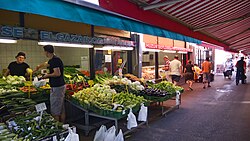 | Der nordöstliche Bereich des Karmelitermarktes im 2. Wiener Gemeindebezirk Leopoldstadt . Der Markt wurde ursprünglich vor der Karmeliterkirche abgehalten und 1888 in die Karmelitergasse verlegt; ab 1893 befanden sich auf dem heutigen Standort bereits einige Markthütten, 1910 wurde der ganze Markt hierher verlegt. Mitte der 1990er Jahre wurde unter dem Marktareal eine Tiefgarage errichtet und gleichzeitig der Markt modernisierend umgestaltet. | Eigenes Werk | C.Stadler/Bwag | Datei:Leopoldstadt (Wien) - Karmelitermarkt.JPG | |