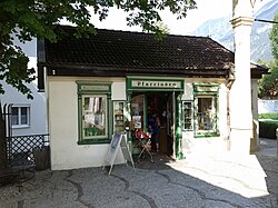 Der Pfarrladen am Friedhof am südlichen Aufgang zur Pfarr- und Wallfahrtskirche entstand zwischen 1879 und 1895 für den Devotionalienhandel. Der gemauerte Bau über rechteckigem Grundriss wird durch ein leicht geschweiftes Satteldach abgeschlossen. Die nach Osten orientierte Hauptfassade weist eine mittige Eingangstür und zwei flankierende Fenster auf. Den Maueröffnungen sind architravierte historistische Ladenvorbauten in grün-weiß gefasstem Holz vorgeblendet.[4] | BDA-Hist.: Q37819503 Status: Bescheid Stand der BDA-Liste: 2024-06-15 Name: Pfarrladen, alte Friedhofskapelle GstNr.: .113/1 |