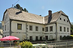 Das ehemalige Hammerherrenhaus Himmelstoß stammt aus dem 16. Jahrhundert. Der zweigeschoßige Bau ist an seiner Ost- und Westseite mit Sgraffiti rund um 1600 verziert, die Sgraffiti wurden 1974/75 restauriert und ergänzt. Das Portal ist mit 1748 bezeichnet, darüber hängt ein neues Wappen der Familie Himmelstoß. Den nordseitigen Giebel schmückt eine bemalte Eisenblechfigur des hl. Florians. | BDA-Hist.: Q37972183 Status: Bescheid Stand der BDA-Liste: 2024-06-15 Name: Bürgerhaus, Himmelstoß, Hammerherrenhaus GstNr.: .142 |