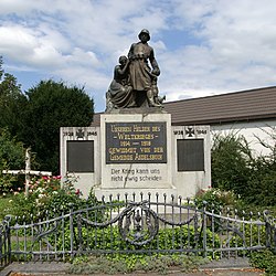 Das Kriegerdenkmal wurde zwischen 1918 und 1938 als dreiteiliges Steindenkmal mit Bronzetafeln errichtet. Der mittlere Steinsockel wird durch eine 1929 von Georg Matt geschaffene[3] Bronzefigurengruppe bekrönt, die eine Frau und ein Kind darstellen, die versuchen einen Soldaten daran zu hindern, in den Krieg zu ziehen. | BDA-Hist.: Q15824426 Status: § 2a Stand der BDA-Liste: 2024-06-15 Name: Kriegerdenkmal GstNr.: 2/5 |