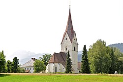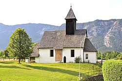 Im höher gelegenen Ortsteil. Urkundlich wurde sie bereits 1559, 1581 und 1661 erwähnt. Heute ist es einfacher barocker Bau des 17. Jahrhunderts, östlich vorgelagerter, niedriger Sakristeiturm mit rundbogigen Schallfenstern und Zeltdach. Eingangslaube mit gemauertem Rundbogeneingang. Eingezogener Chor. Am durch Gesimse gegliederten Langhaus barocke Rechteckfenster. Einheitliche Eindeckung. Rundbogiges barockes West-Portal.[20] | BDA-Hist.: Q38063327 Status: § 2a Stand der BDA-Liste: 2024-06-15 Name: Kath. Filialkirche hl. Oswald und Friedhof GstNr.: .41 |
