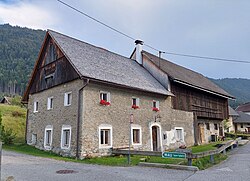 Der zweigeschoßige Streckhof mit steinsichtigen Fassaden und Satteldächern stammt aus der Zeit um 1600. Die kleinen Fenster haben teilweise Rautengitter. Das Innere gliedert sich in Mittelflurerschließung (Lab'n) mit großer und kleiner Stube, Rauchküche und ebenerdigem „Keller“. Darüber ist die Oberlab'n mit zwei weiteren Zimmern. Am Wohnhaus ist der Kuh- und Schweinestall angebaut, darüber befindet sich ein Stadel. | BDA-Hist.: Q126122356 Status: Bescheid Stand der BDA-Liste: 2024-06-15 Name: Ruppitsch-Hube GstNr.: .72 |