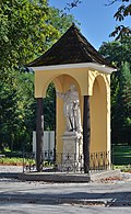 Die Statue des hl. Johannes Nepomuk steht unter säulengestütztem Dach bei der Brücke über den Michelbach, am Sockel Stifterinschrift und Chronogramm 1729 und 1732. | BDA-Hist.: Q37945872 Status: § 2a Stand der BDA-Liste: 2024-06-15 Name: Nischen-/Kapellenbildstock hl. Johannes Nepomuk GstNr.: 874 |