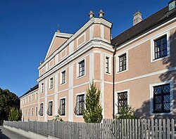 Das Schloss Jeutendorf, ein ehemaliges Wasserschloss des 16. Jahrhunderts, wurde 1810 nach Plänen des Architekten Josef Kornhäusel umgebaut. Von der ursprünglich vierflügeligen Anlage sind drei Flügel mit zweigeschoßigen Fassaden sowie ein runder südöstlicher Eckturm erhalten. Der ebenfalls runde Eckturm im Nordosten stammt aus dem 19. Jahrhundert, die hofseitige Terrasse und die Freitreppe aus dem Jahr 1920. Im Inneren befinden sich unter anderem kreuzgratgewölbte Räume mit Stuckrippen aus der zweiten Hälfte des 16. Jahrhunderts im Obergeschoß, in einem Raum eine biedermeierliche Fenstertäfelung aus der Zeit um 1810 sowie eingemauerte Reliefs (hl. Anna, Maria Hilf) aus dem 18. Jahrhundert. Das Schloss ist von einem Park umgeben, der wohl um 1810 als englischer Garten angelegt wurde. | BDA-Hist.: Q37946315 Status: Bescheid Stand der BDA-Liste: 2024-06-15 Name: Schloss Jeutendorf GstNr.: 86, 85, 88 Schloss Jeutendorf |