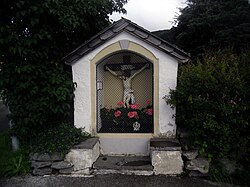 Der offene Kapellenbildstock stammt aus der ersten Hälfte des 19. Jahrhunderts. In der karniesbogenförmigen Nische mit Keilstein befindet sich ein barockes Kruzifix.[3] | BDA-Hist.: Q38114098 Status: § 2a Stand der BDA-Liste: 2024-06-15 Name: Schwaben-Kapelle GstNr.: 1151 |
