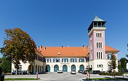 Der große U-förmige Bau mit einem fünfgeschoßigen Turm wurde 1916 im Heimatstil errichtet. | BDA-Hist.: Q38016762 Status: Bescheid Stand der BDA-Liste: 2024-06-15 Name: Feuerwehrgebäude GstNr.: 1151/115 Fire station in Neurißhof |