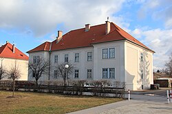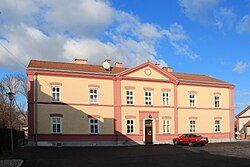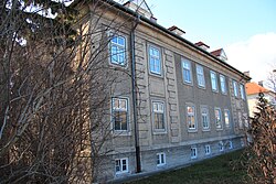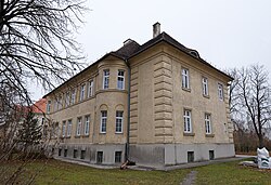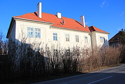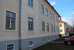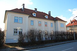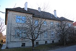 Das zweigeschoßige ehemalige Kommandantenwohngebäude der k. und k. Pulverfabrik aus dem Jahr 1891 diente ab den 1930ern als Pfarrhof sowie Kollegium des Kalasantiner-Ordens. | BDA-Hist.: Q38113705 Status: § 2a Stand der BDA-Liste: 2024-06-15 Name: Pfarrhof und Kalasantiner-Kollegium GstNr.: 1279 |