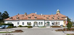 Das Direktionsgebäude der ehemaligen Kaserne schufen Siegfried Theiss und Hans Jaksch im Jahr 1915. Das stattliche zweigeschoßige Bauwerk weist ein Attikageschoß, hohe Walmdächer sowie über dem Rundbogenportal einen dreiteiligen Erker auf. | BDA-Hist.: Q38017041 Status: Bescheid Stand der BDA-Liste: 2024-06-15 Name: Wohnhaus, ehem. Direktionsgebäude GstNr.: 1272/4 Direktionsgebäude Hauptallee 3, Blumau |