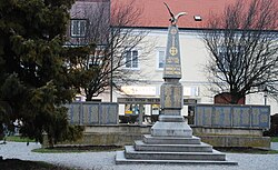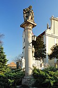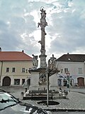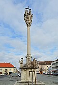 Die Mariensäule wurde 1707 errichtet. Auf einem hohen prismenförmigen Unterbau das Relief des knienden Stifterpaares und Inschriften. Um die wolkenumwundene Säule mit einer Maria Immaculata stehen 4 Engelsstatuen.[5] | BDA-Hist.: Q37762208 Status: § 2a Stand der BDA-Liste: 2024-06-15 Name: Mariensäule GstNr.: 3 Mariensäule, Bruck an der Leitha |