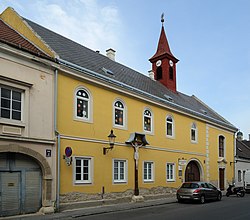 Die Kapelle beherbergt die Kreuzigungsgruppe aus der abgetragenen romanischen Martinskirche. | BDA-Hist.: Q37832300 Status: Bescheid Stand der BDA-Liste: 2024-06-15 Name: Angebaute Kapelle GstNr.: 507 Kapelle Theodor-Körner-Platz, Bruck an der Leitha |