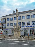 Die Mariensäule wurde 1713 errichtet und 1992 restauriert. Auf einem Postament mit Statuen der hll. Sebastian, Rochus, Martin und Johannes Nepomuk auf der Säule eine gekrönte Maria Immaculata. Neben der Säule steht das gebauchte Steinbecken eines 1957 abgetragenen Röhrbrunnens.[2] | BDA-Hist.: Q37765696 Status: § 2a Stand der BDA-Liste: 2024-06-15 Name: Mariensäule GstNr.: 511/3 |