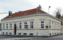 Der Kindergarten wurde 1898 eröffnet. Das eingeschoßige Eckhaus hat eine späthistoristische Putzfassade, ein Rundbogenportal mit gerader Verdachung und in den Zwickeln in Stuck die Kaiserinsignien.[15] | BDA-Hist.: Q37765688 Status: § 2a Stand der BDA-Liste: 2024-06-15 Name: Kindergarten GstNr.: 401 |