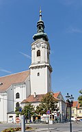 | Südostansicht der röm.-kath. Pfarrkirche hl. Dreifaltigkeit in der niederösterreichischen Stadtgemeinde Bruck an der Leitha . Links der Sockel mit einer Statue der 1707 errichteten Mariensäule und rechts der 1713 erbaute Florianibrunnen. Die Kirche wurde von 1696 bis 1702 unter Einbeziehung des Stadtturmes errichtet. Dieser ist bis zum Schallgeschoss mittelalterlich (um 1230). Der Umlaufgang wurde im 16. Jahrhundert errichtet und das barocke Glockengeschoss um 1740. Die schmucklose Stirnfront wurde ebenfalls in dieser Zeit (1738–40) umgebaut. Unter anderem wurde sie mit einem geschosstrennenden Gebälk, einem giebelbekrönten Obergeschoss und einem dreiachsigen Mittelrisalit gegliedert. Zusätzlich wurden 6 Rundbogennischen für Steinstatuen eingebaut. | Eigenes Werk | C.Stadler/Bwag | Datei:Bruck an der Leitha - Kirche.JPG | |