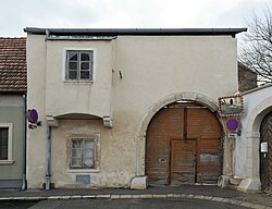 Das Gebäude hat im Obergeschoß zwei freigelegte frühgotische Biforen aus gefasten Spitzbogen aus der Mitte bis 3. Viertel des 13. Jahrhunderts und eine spitzbogige Nische mit genastem Blendspitzbogen aus dem 14. Jahrhundert. Das gefaste Rundbogenportal mit seinem Löwenkopfscheitelstein stammt aus der Zeit um 1600, die Torflügeln aus der Mitte des 19. Jahrhunderts. Im Obergeschoß hofseitig teilweise vermauerte Pfeilerarkaden. Die Einfahrt und beide Geschoße sind mit Kreuzgratgewölben bzw. Stichkappentonnen gedeckt, ein Raum trägt im Gewölbescheitel die Bezeichnung 1724.[6] | BDA-Hist.: Q37762586 Status: Bescheid Stand der BDA-Liste: 2024-06-15 Name: Bürgerhaus GstNr.: 367 |