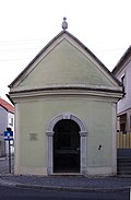 Recht qualitätvolle, von der politischen Gemeinde[3] 1805 erbaute spätbarocke Architektur, von den Nachbarhäusern räumlich etwas abgesetzt. Gegen die Straße konkav vorschwingende Giebelfront mit kräftigem durchlaufendem Kranzgesims, glattem hohem Dreiecksgiebel, bekrönt von steinernem Vasenaufsatz. Profiliertes Rundbogenportal mit Keilstein und Kämpfergesimsen (Sandstein) samt Schmiedeeisengittertür.[4] Der längsovale Innenraum ist von einer Flachkuppel bekrönt. An der Ostseite sind drei Figurennischen ausgespart, mit dem hochbarocken unterlebensgroßen Hl. Nepomuk in der Darstellung des Prager Domherrn[3] als mittlere Figur. Die Längsseiten zeigen geknickte Rundbogenfenster.[4] |
