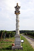 Die Dreifaltigkeitssäule auf dem Weinberg ist mit 1715 bezeichnet. Eine gewundene Weinlaubsäule trägt den Gnadenstuhl. | BDA-Hist.: Q38130607 Status: § 2a Stand der BDA-Liste: 2024-06-15 Name: Pest-/Dreifaltigkeitssäule GstNr.: 7002 |