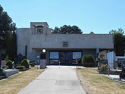 Die Aufbahrungshalle wurde 1971–1973 von Matthias Szauer errichtet. Sie ist in Sichtbeton ausgeführt und gilt daher als Bauwerk des Brutalismus. An die rechteckige Halle mit einem glockenturmartigen Aufbau sind zwei halbzylindrische Kapellenbauten angefügt.[2] | BDA-Hist.: Q105626961 Status: Bescheid Stand der BDA-Liste: 2024-06-15 Name: Aufbahrungshalle GstNr.: 4853 Aufbahrungshalle Deutschkreutz |