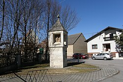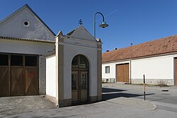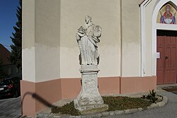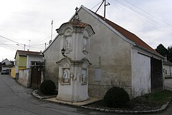 Der Bildstock trägt die Jahreszahl 1742. | BDA-Hist.: Q37719444 Status: § 2a Stand der BDA-Liste: 2024-06-15 Name: Figurenbildstock hl. Johannes Nepomuk GstNr.: 307 Statue of John of Nepomuk in Drasenhofen |