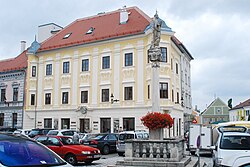 Der Brunnen am Hauptplatz wurde erstmals 1541 erwähnt. Er hat eine quadratische Steineinfassung des späten 18. Jahrhunderts, in deren Mitte ein gestuftes Postament mit einer Adlerfigur steht. | BDA-Hist.: Q38092284 Status: § 2a Stand der BDA-Liste: 2024-06-15 Name: Brunnen GstNr.: 2368/8 |
