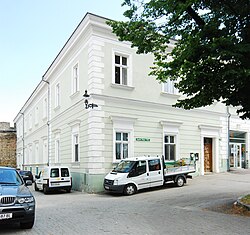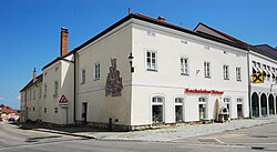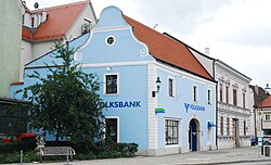 Das zweigeschoßige Wohnhaus aus der zweiten Hälfte des 18. Jahrhunderts hat einen geschwungenen Giebel mit seitlichen Putzvoluten und ein mit 1818 bezeichnetes rundbogiges Steingewändeportal. | BDA-Hist.: Q37953888 Status: Bescheid Stand der BDA-Liste: 2024-06-15 Name: Volksbank GstNr.: 178 |